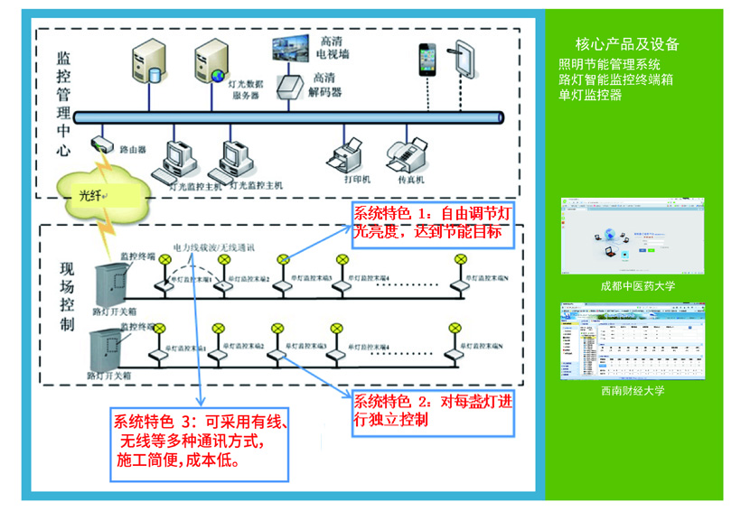 路燈單燈監控系統,可通過監控管理中心操控檢測,利用光纖網絡,實現四遙(遙控、遙測、遙調、遙信)遠控功能。實時單燈監控末端的系統參數:電壓、電流、開關狀態等,此傳輸方式不會產生營運費。通過管理軟件,可遙控遙測到具體的某一盞路燈,給日常維護提供了遠程診斷依據,大大減輕維護工作量,節省人力物力,綠色高效。
